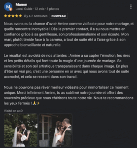 Quelques jours après la livraison de leur film de mariage, Manon m’a laissé un message touchant sur Google.